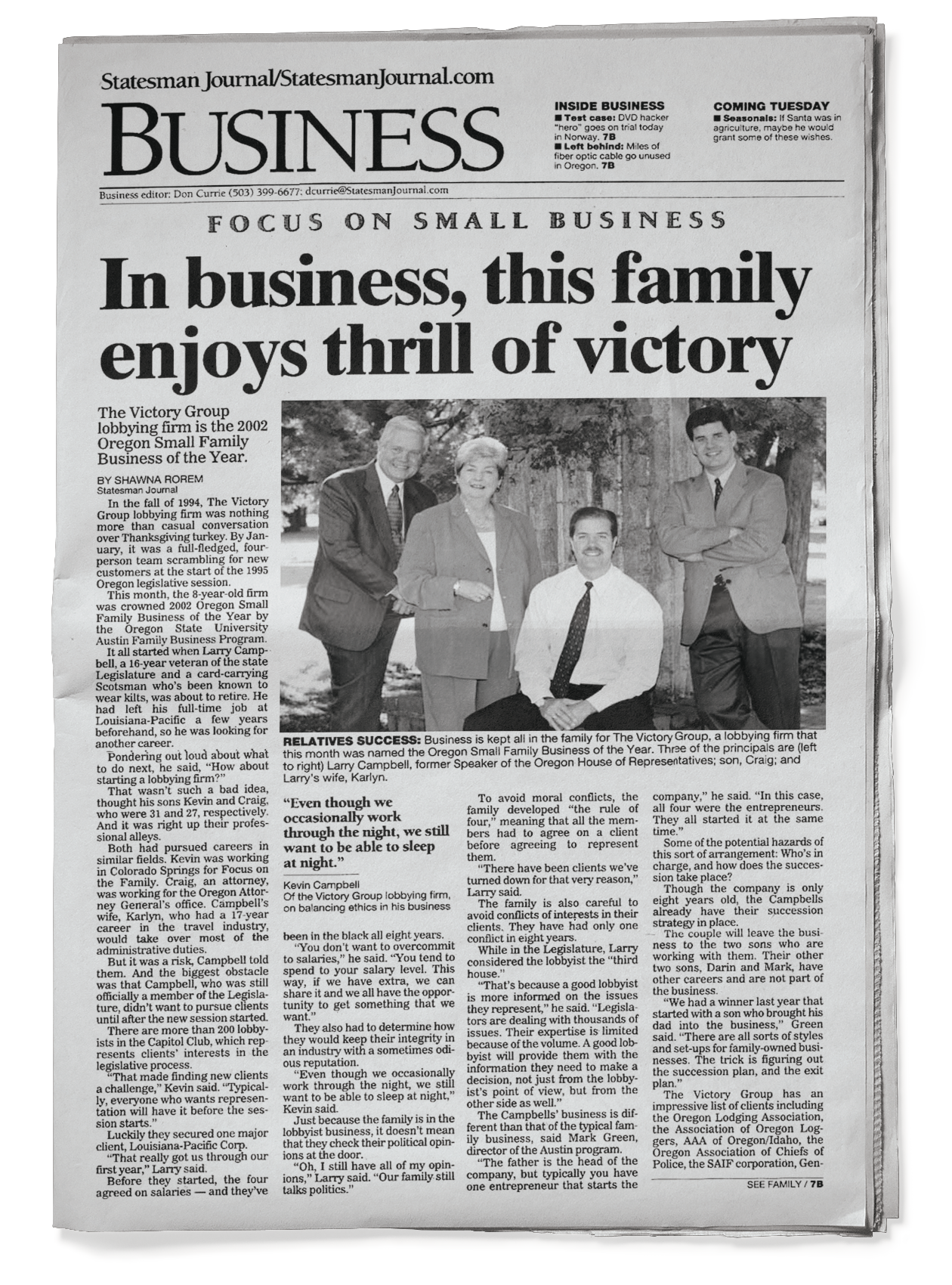 While gathered for Thanksgiving in 1993, then Oregon Speaker of the House Larry Campbell, wife Karlyn, and sons Kevin, Craig, and Darin discussed the possibility of creating a family governmental affairs business.1994